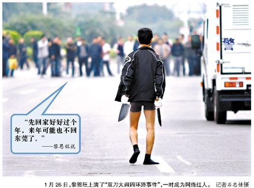1月26日,黎恩旺向原工作單位索要三萬(wàn)元開(kāi)發(fā)廊店,遭到拒絕當(dāng)即脫掉衣褲,持兩把殺豬刀大鬧東莞四環(huán)路。隨后,在媒體的報(bào)道下,以其桀驁的表情、經(jīng)典的話語(yǔ),迅速走紅網(wǎng)絡(luò),被稱“雙刀男”。他自稱“沒(méi)衣服、沒(méi)飯吃,就只能去偷去搶。并不是我不想做好人,是家庭環(huán)境、社會(huì)現(xiàn)實(shí)沒(méi)有給我機(jī)會(huì)。有錢(qián)人什么都有,我連煙都沒(méi)得抽。與其茍且活著,不如通過(guò)這樣來(lái)改變命運(yùn)。”