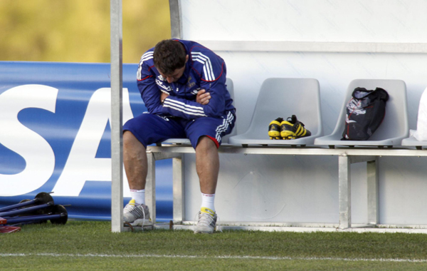 體能教練迪韋納在與隊員發(fā)生爭執(zhí)后坐在場邊。圖片來源:路透