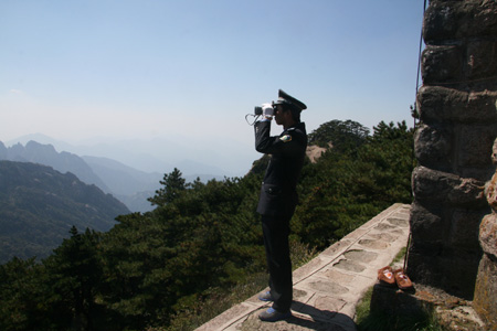 小隊(duì)長(zhǎng)陳曉川在仔細(xì)的對(duì)景區(qū)進(jìn)行防火瞭望