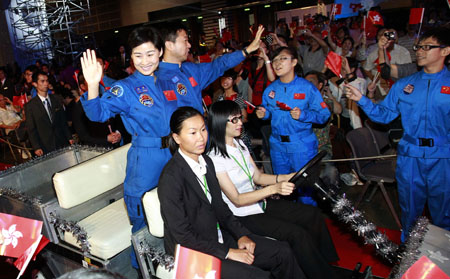 當(dāng)日,正在訪港的神舟九號(hào)航天員景海鵬、劉旺、劉洋出席在香港會(huì)議展覽中心舉行的大匯演,與約兩千名觀眾會(huì)面,一同分享成功完成航天任務(wù)的喜悅。