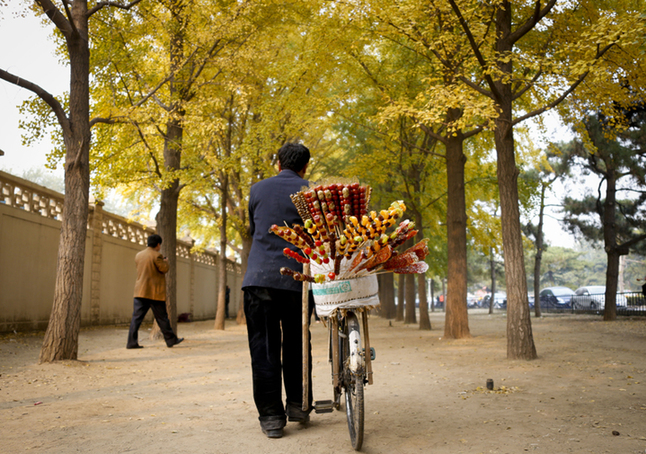 一位賣冰糖葫蘆的小販在游人眾多的銀杏大道上兜售。 中國日報記者 匡林華 攝