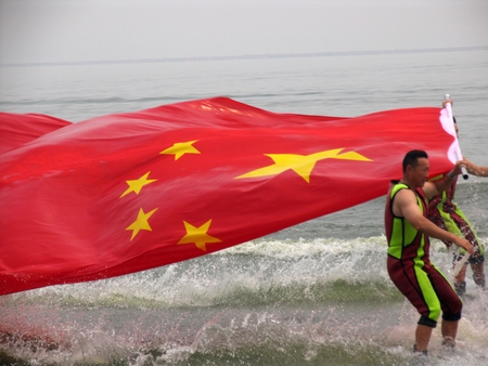 賽后中國隊(duì)運(yùn)動(dòng)員手擎五星紅旗在水面上飛馳而過