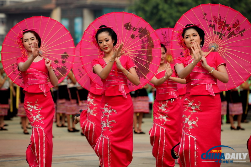 2013年4月14日,在云南省西雙版納傣族自治州景洪市的潑水廣場上,上萬名各族群眾跳起傣族紙傘舞,慶祝一年一度的傣歷新年潑水節(jié)。