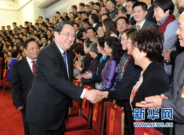 2012年12月17日,第九次全國臺灣同胞代表會議在北京開幕。俞正聲出席會議并講話。這是俞正聲親切會見與會代表。 新華社記者李濤攝
