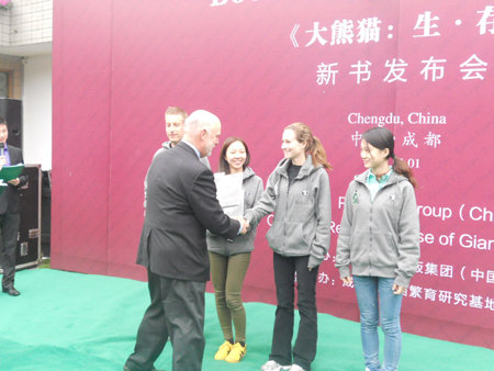 美國(guó)華盛頓國(guó)家動(dòng)物園園長(zhǎng)Dennis Kelly給"2012成都全球招聘熊貓守護(hù)使”16強(qiáng)選手贈(zèng)送《大熊貓:生?存》一書。