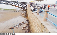 29日上午,記者聞訊趕到現(xiàn)場,清障人員正駕駛起重機將奧迪車抬離。這輛白色奧迪車車體嶄新,但左前方發(fā)動機艙已經(jīng)嚴重變形,駕駛室也已經(jīng)癟了,天窗和左側車門扭曲變形,右前方輪胎也幾乎要掉下來。奧迪車車體已經(jīng)探出堤壩,岸邊兩根石柱和欄桿被撞到海里,連堤壩邊緣的條石也被帶了下去。