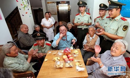 9月20日,消防戰(zhàn)士和老人們一起唱歌。新華社記者凡軍攝