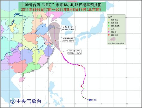 受“梅花”影響,8月6日20時(shí)至7日20時(shí),黃海大部、東海大部、浙江東北部及沿海、上海東部、杭州灣、長(zhǎng)江口、江蘇沿海、山東半島南部和東部沿海將有7-9級(jí)大風(fēng),部分海域或地區(qū)陣風(fēng)可達(dá)10-12級(jí),“梅花”中心經(jīng)過的附近海面的風(fēng)力有10-13級(jí),陣風(fēng)可達(dá)14-15級(jí);臺(tái)灣海峽、臺(tái)灣以東洋面、浙江南部沿海、臺(tái)灣北部和東部沿海、福建北部沿海也將有6-7級(jí)大風(fēng),陣風(fēng)可達(dá)8-9級(jí);河北東部、天津東部、山東中東部、江蘇東部、上海、浙江東部等地將有大到暴雨,其中江蘇東部、上海、浙江東部等地局地有大暴雨。