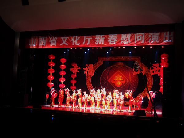 臺上,來自山西省歌舞劇院、山西省曲藝團等單位的多位藝術家聯手為當地觀眾送上了一場精彩的文藝演出,演出在大型舞蹈《紅紅火火拜大年》中火熱開場,《飛花的中國遍地歌》、《中國夢 山西夢》、《日月圖》、《土豆情》……獨唱、快板、晉劇、二人臺等多種藝術表演形式輪番上陣,整場演出內容新穎、形式多樣,觀眾們連呼過癮,現場氣氛也被一次次地推向高潮。