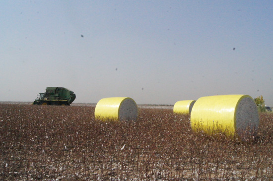 10月19日,一臺(tái)美國(guó)迪爾7760型采棉機(jī)在新疆生產(chǎn)建設(shè)兵團(tuán)第六師共青團(tuán)農(nóng)場(chǎng)兵團(tuán)國(guó)家級(jí)現(xiàn)代農(nóng)業(yè)示范區(qū)的棉田里采收棉花作業(yè)。這臺(tái)采棉機(jī)當(dāng)籽棉箱裝滿后,機(jī)車尾部會(huì)自動(dòng)吐出一個(gè)直徑2.29米、寬度2.39米、重量2500公斤左右的由金黃色包裝膜包裝而成的柱體棉包。棉田中隨處可見的一個(gè)個(gè)金黃色的棉包被職工們貼切地稱為“黃金蛋”。今年,該場(chǎng)在2011年實(shí)現(xiàn)棉花全程機(jī)械采收的基礎(chǔ)上,又實(shí)現(xiàn)了棉花100%全程機(jī)械采收、機(jī)械打包一條龍作業(yè)。