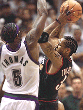 Iverson, whose various bruises around his hips and buttocks hampered him in Game Two, scored 28 points and got plenty of support from his teammates as the 76ers took back the homecourt advantage they sacrificed by resting the battered league Most Valuable Player in Saturday's Game Three six-point defeat. Dikembe Mutombo scored 17 points and grabbed 15 rebounds and Tyrone Hill scored 14 and snared six boards. "We knew that we played a great game on Saturday but we just didn't finish our job," said Mutombo. "So we came out tonight we tried to play hard from the beginning with the help of AI (Iverson) and it was just great." Eric Snow, like Hill a disappointment in Game Three, made some big plays down the stretch for Philadelphia and recorded three steals, three assists and four rebounds playing 26 minutes on an injured ankle.. Aaron McKie had nine assists and Iverson, who played all but a fraction of a minute, dished out eight. Reserve Jumaine Jones scored eight points and grabbed nine rebounds in 27 minutes. BIG DOG For Milwaukee, Glenn "Big Dog" Robinson scored 20 points and collected 10 rebounds but lost his cool and drew two technical fouls late in the game for continuing to argue after Snow stole the ball from him and no foul was called. Tim Thomas came off the bench to score 15 points and Sam Cassell and Ray Allen each had 14 points as the "Big Three" of Robinson, Cassell and Allen came up short for the Bucks. It was a rough game typified by a play with two minutes to go when Allen, protecting the ball, hit Iverson with an elbow, sending him to the floor. Iverson stood up like a wobbling boxer, blood in his mouth. Allen grimaced over the pain in his elbow, which also was bleeding. No foul was called. Snow made perhaps the biggest shot of the game with 2:18 to go when Iverson was in trouble in the lane, managed to get the ball back to the top of the arc and into the hands of McKie, who whipped it around to Snow on the left side for a jumper to make it 82-75, Snow then made the steal off Robinson, who appeared to have been bumped by McKie, and an Iverson layup made the score 84-77. Iverson then stole the inbounds pass and was fouled with 59 seconds remaining, and the still-fuming Robinson was called for two technical fouls. Iverson made three of the four free throws to put the Sixers -- the best road team in the league during the regular season -- up by 10, the biggest lead of the game. Game Five is Wednesday in Philadelphia. "With Allen feeling good definitely we're going to win that game in Philadelpia and then we're going to come here and try to finish it off," Mutombo said. |