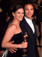 Julia Roberts holds her Best Actress Oscar at the 73rd annual Academy Awards as she and boyfriend Benjamin Bratt arrive at the Vanity Fair post-Academy Awards party at Mortons in Los Angeles in this March 25, 2001 file photo. [Reuters]