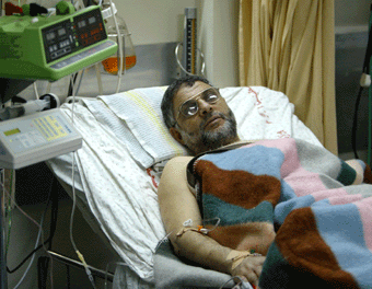 Wounded Hamas leader Abdel-Aziz al-Rantissi lies in a hospital bed June 10, 2003 in Gaza City, in the Gaza Strip. Al-Rantissi, a political leader of the militant Islamic group Hamas, survived an Israeli missile strike on his car in Gaza City Tuesday. Al-Rantissi, 55, is a co-founder of Hamas and a political aide to Sheikh Ahmed Yassin, Hamas's spiritual leader and one of its founders. [Reuters]