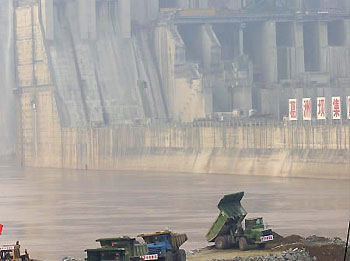 | | |  | | | Trucks dump earth and rocks at the end of an extending cofferdam as the Yangtze River water was diverted to flow through the dam of the Three Gorges Project. At the end of the project's second-phase which was signaled with the completion of the left-bank power house and the spillway, engineers blocked the Yangtze River again to force the water going through the dam so as to make room for the building of the right-bank powerhouse. [newsphoto.com.cn] | | | | | | | | | |