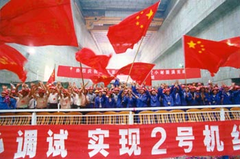 Workers wave flags July 7 to celebrate a successful test run of the generator Unit II, the first of all 26 Three Gorges Project units that has been installed and finished a adaptation. [newsphoto.com.cn]