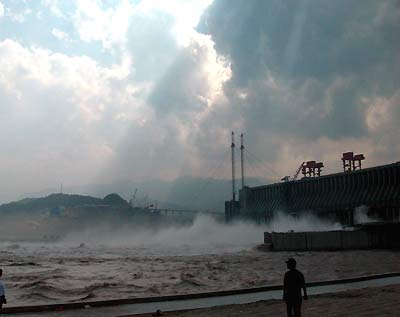 Sun light beams falls upon the reservoir behind the Three Gorges dam on July 14, 2003.