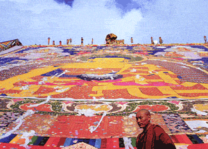Around 9 o'clock, after her children have all gone to work, Yamzhoin begins to take ritual walks three times along the Bakor Street of the Jokhang Monastery. With a prayer wheel turning in her right hand and the Buddha beads twisted in her left hand, she recites the Six-Prayer Words repeatedly. Noon has almost arrived when she finishes the ritual walks. She then buys some beef and vegetables for lunch at the Chongsaikang Grocery Market and goes home to prepare lunch. Through rain, wind or even during the coldest days of the year, Jokhang Monastery and Potala Palace are always encircled by elderly Buddhist devotees like Yamzhoin, who pray and kowtow along the walk, wishing for happiness and health for themselves and others. For Tibetans, Buddhism is part of their lives. The festivals There are more than 150 festivals within a year in Tibet. There are several major religious days every month. All of these festivals are intertwined with the devoutly religious culture. The fourth month of the Tibetan calendar is called the Sagya Dawa Festival by Buddhists. The 15th day of the month commemorates Sakyamuni's birth, Nirvana and becoming Buddha.