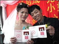 The couple -- Zhang Lin (L) and her husband -- show their marriage certificate to