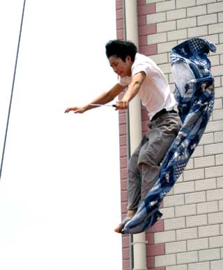 A man, a kitch knife in hand, jumps off from a 4-story building in