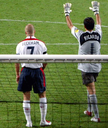 and Portugal's goalkeeper Ricardo (R) react following Beckham's extra-time