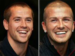 David Beckham (L) poses for photographs during a news conference