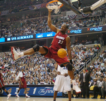 Miami Heat's Alonzo Mourning (33) dunks in