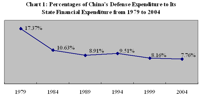 Maintaining a Low Level of Defense Spending China has always put emphasis on the control of its defense expenditure scale. The defense spending is appropriately allocated under the guideline of coordinated development of national defense and economy. Since the adoption of the reform and opening-up policies, the Chinese government has kept its defense expenditure under strict control in order to concentrate its strength on economic development. From 1979 to 2004, the percentages of China's defense expenditure to its financial expenditure of the same period followed a downward curve on the whole. It was 17.37% in 1979, and 7.76% in 2004, down by about 10 percentage points.