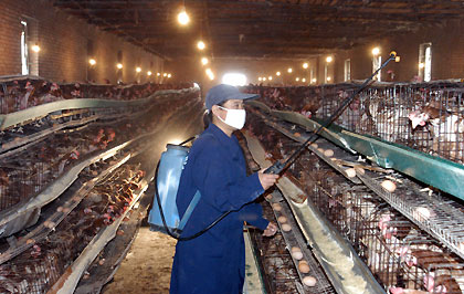 A worker disinfects a poultry farmhouse in Mudanjiang, northeastern China's