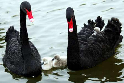 | A family of black geese at a zoo in Wuhan, Hubei province, February 2, 2004. Local authorities disinfected the zoo after 11 out of China's more than 30 provinces and regions reported confirmed or suspected outbreaks of the avian influenza that has spread to 10 Asian countries and killed at least 10 people in Vietnam and Thailand. [Reuters] |