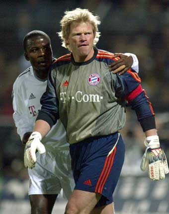 Bayern Munich's Samuel Kuffour (L) hugs Oliver Kahn (R) during a German Cup quarter-final match against Alemannia Aachen in Aachen February 4, 2004. Aachen won the match 2-1 and reaches the half final of the German Soccer Cup. [Reuters]