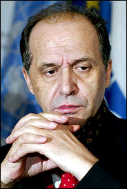 Kosovo's Prime Minister Bajram Kosumi leaves the presidencial residence in Pristina after visiting the family of late president Ibrahim Rugova Saturday, Jan. 21, 2006. Rugova, who died Saturday from lung cancer at the age of 61, was elected president in 2002, three years after a NATO bombing campaign ended a crackdown on ethnic Albanian separatists by Yugoslav troops. To many, he embodied the ethnic Albanians' struggle for independence from Serbia. [AP]