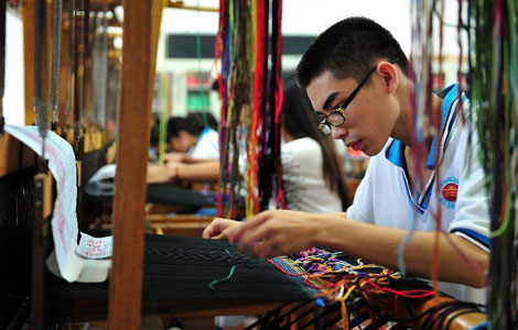 Models present creations from PINGHE by Chinese designer He Ping during London Fashion Week Spring/Summer 2014, at the Fashion Scout venue in London, on Sept 13, 2013.[Photo/Xinhua] |
