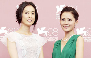 Leading actress of the film "The Sword Identity" Zhao Yuanyuan and actor Song Yang pose as they arrive on the red carpet for the screening of the film at the 68th Venice Film Festival September 6, 2011.