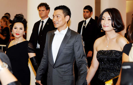 Actor Andy Lau and actress Qin Hailu pose for photographers as they arrives on the "Tao Jie" (A Simple Life) red carpet at the 68th Venice Film Festival September 5, 2011.