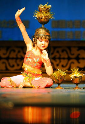 A child contestant performs during the "Stars Shine Over Tianshan Mountain" talent show in Urumqi, in northwest China's Xinjiang Xinjiang Uygur Autonomous Region, August 13, 2009. [Xinhua]
