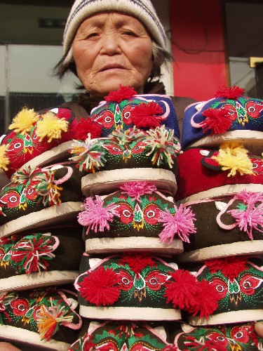It's a custom to keep three pairs' of tiger shoes for the baby, respetively in scarlet, blue and purple. As always, red represents an auspicious life; blue, homophonic with "blocking' in Chinese, means all misfortunes can be blocked away from the baby. And finally, a pair of tiger shoes in purple. Purple, being homophonic with "son" in Chinese, predicts bright prospects for a son. Tiger shoes have a long history. Some even believe they originated from a mythologically-ancient story. Long ago, in the famous old town of Yangzhou lived a boatman called Big Yang, who was very generous and ready to help others. Moved by his help and charity, an old female passenger presented him a gorgeous drawing. In the picture, a beautiful girl was embroidering a pair of tiger shoes. The boatman appreciated it and put it on the wall of his home. A miracle happened, the girl in the picture stepped out of the picture every