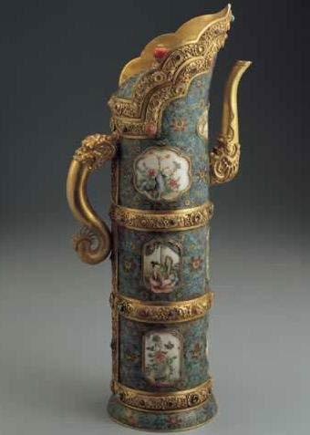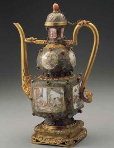 Domu tea-pot is the container of butter tea, known as the Tibetan Dong Mo or Mu. Tibetan butter tea, a necessity of life for Tibetans, is boiled with butter, salt and milk. When water and butter is blended completely, the butter tea can be drunk, with a special flavor. This tea-pot is full of the royal style, and has both decorative and practical value. 4. Wire inlayed cloisonné enamel lady holing pot
