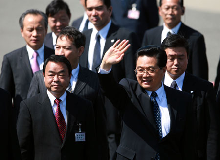 Chinese President Hu Jintao waves upon his arrival at Tokyo's Haneda airport May 6, 2008. Hu began his five-day "warm spring" trip to Japan, aimed at boosting the strategic and mutually beneficial relationships between the two countries.[Xinhua]