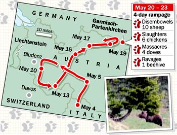經(jīng)過這么多天的長途跋涉,這頭棕熊可真是又餓又累,“終身大事”暫放一邊,填飽肚子再說。巴伐利亞州的加米施-帕騰基的農(nóng)場成了它的“打秋風”的餐館。在5月20日到23日的4天時間里,它如“鬼子進村”般,吃了10只羊、6只雞、4只鴿子,還搗了一個馬蜂窩。一名牧羊人心疼地控訴說,它的羊被這頭棕熊掏了心和肺。