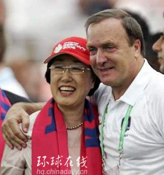 與默克爾一樣,韓國總理韓明淑也是本國的第一個女總理,而在賽場上她只是一個普通球迷。6月13日,韓明淑在韓國足協(xié)主席鄭夢準(zhǔn)陪同下抵達(dá)德國法蘭克福球場,觀看韓國對多哥的首戰(zhàn)。