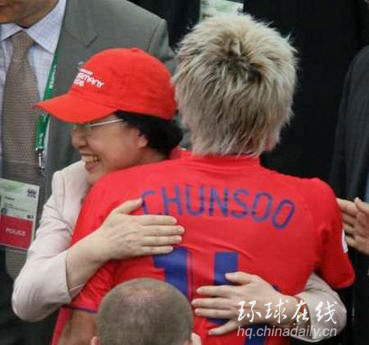 比賽進行期間,韓明淑與韓國“紅魔”球迷啦啦隊一起熱情地高呼“大韓民國!大韓民國!”,手中還不時地?fù)]舞一塊紅絲巾為韓國國家足球隊加油鼓氣。當(dāng)韓國最終以2比1取勝后,韓明淑總理興奮不已,來到球場邊與隊員和教練握手、擁抱、合影,當(dāng)起了“追星族”