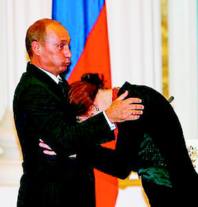 當時情景與戰(zhàn)爭電影中妻子迎接從前線歸來的丈夫時的片斷非常相像。此時此刻普京臉上的表情非常令人回味,既有難堪,又有苦笑,想說什么又說不出口,驚訝、手忙腳亂、某種難以描述的感情應有盡有,總之是尷尬萬分。不過,女演員似乎并沒有發(fā)覺這些效應,在普京胸前深情偎依后,心滿意足地回到自己座位。普京立刻感到一臉輕松,但剛過了一秒鐘,突然又現(xiàn)出了有點懼怕的表情,原來女演員又回來了!幸運的是,這次她只是想和總統(tǒng)合影,不再有其他舉動。