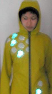 panel)連接在一起。伊莉斯說,當(dāng)水珠碰到其中的一個傳感器時,雨衣前面相應(yīng)的燈就會亮起來,此時便會產(chǎn)生映出雨水節(jié)奏的一閃一閃的照明圖案。她說:“你會看到一副類似于雨點跌落的燈光圖案!