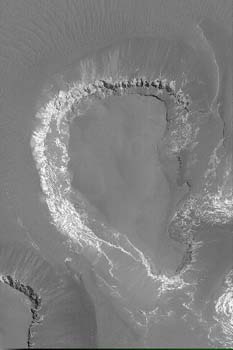 NASA在12月宣布,科學(xué)家已經(jīng)找到火星上存在液態(tài)水的最有力證據(jù),而且就出現(xiàn)在最近7年內(nèi)!兩個曾在1999年和2001年被拍攝的南半球隕石坑,在2004年和2005年再次被拍攝時已經(jīng)發(fā)生了明顯變化。每個隕石坑周邊都有5到10個干涸的水池,而在從坑壁頂?shù)剿刂g綿延數(shù)百米的溝槽中,出現(xiàn)了淺色、發(fā)亮的沉淀物,這些在最早的照片中是沒有的?茖W(xué)家由此推論,這可能是水流過后遺留下的淤泥、鹽分和霜結(jié)晶。這個令人興奮的發(fā)現(xiàn)可謂火星探測史上一項(xiàng)意義重大的突破,它令這顆紅色星球存在生命宜居環(huán)境的可能性大增,也讓人類離“移民外星“的夢想又近了一步。