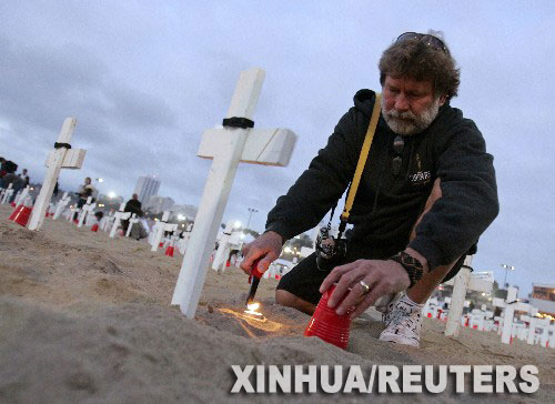 一名男子在紀(jì)念伊戰(zhàn)陣亡士兵的十字架旁點燃蠟燭。