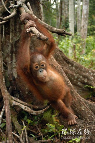 一只紅毛猩猩在樹(shù)枝間玩耍。由于賴以生存的森林遭到毀壞,聚居在印尼加里曼丹以及蘇門(mén)答臘島上的大約3萬(wàn)只猩猩面臨生存危機(jī)。