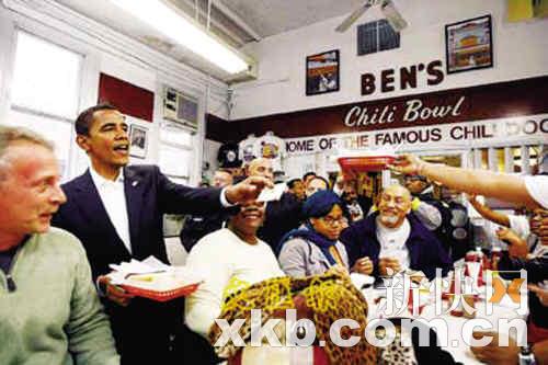 10日,奧巴馬與華盛頓市長芬蒂,到當?shù)厥兄行囊婚g著名的熱狗快餐店進餐。由于正值午餐時間,店內(nèi)大批顧客見到奧巴馬大駕光臨,無不歡喜尖叫。奧巴馬向顧客打招呼并拍照留念,又抱起一名嬰兒,盡顯親民一面。經(jīng)過一輪哄動,奧巴馬也沒有忘記此行目的,向職員詢問:“食物在哪?”引起全場大笑。