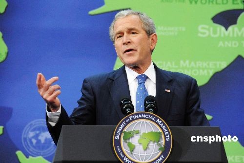 二十國(guó)集團(tuán)領(lǐng)導(dǎo)人金融市場(chǎng)和世界經(jīng)濟(jì)峰會(huì)2008年11月15日在華盛頓閉幕。在隨后舉行的國(guó)際媒體記者招待會(huì)上,峰會(huì)東道主、美國(guó)總統(tǒng)布什表達(dá)了對(duì)美國(guó)未來(lái)總統(tǒng)奧巴馬的祝愿。中新社發(fā) 邱江波 攝