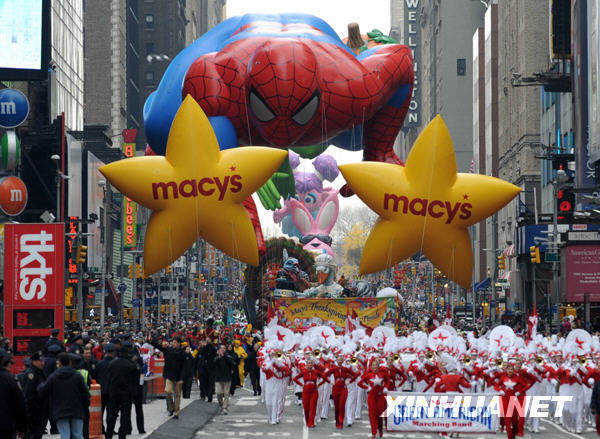 11月26日,參加感恩節(jié)游行的隊(duì)伍從美國(guó)紐約時(shí)報(bào)廣場(chǎng)經(jīng)過(guò)。當(dāng)日,2009梅西感恩節(jié)花車與氣球大游行在紐約曼哈頓舉行。梅西感恩節(jié)大游行始于1924年,是全美最盛大的感恩節(jié)慶典,每年都會(huì)吸引數(shù)百萬(wàn)人沿途觀看。新華社記者申宏攝