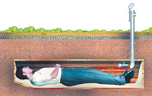 棺材入土后,很難得知死者有沒有還魂復(fù)活。美國(guó)發(fā)明家威勒斯設(shè)計(jì)的棺材潛望鏡,為的就是滿足家屬好奇心,可供外界窺視死者是否真的已入土為安。據(jù)了解,這個(gè)產(chǎn)品至今尚未上市,堪稱搞怪創(chuàng)意之首。